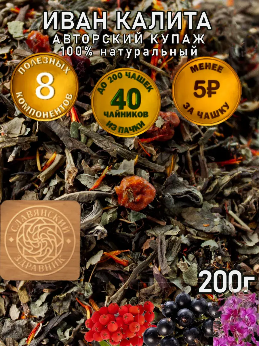 "Иван Калита" - это чайный шедевр от бренда «Славянский здравник»! Изысканный напиток для истинных ценителей. Погрузитесь в мир настоящего чайного искусства с новым травяным сбором. Этот уникальный фиточай создан для тех, кто ценит качество и заботится о своём душевном равновесии. Крупнолистовая заварка включает в себя благородные компоненты: - сенча и ганпаудер — основа напитка, дающая глубокий вкус зеленого чая; - иван-чай — традиционное успокоительное растение; - ягодные добавки: рябина красная и смородина черная поддерживают сердце, укрепляют сосуды, поддерживают иммунитет; - листья земляники и смородины — натуральные ароматизаторы и оказывают мягкое очищающее и противовоспалительное действие. - сафлор — природный краситель и полезная добавка, т.к. богат антиоксидантами и помогает пищеварению. Рассыпной сбор обладает релакс-эффектом благодаря натуральным успокоительным травам, а так же отличным вкусом за счет ягодного букета. Чай "Иван Калита" - это вкусный и полезный напиток, который дарит умиротворение! Этот успокоительный чай станет прекрасным подарочным решением для: - преподавателя — знак уважения и заботы; - воспитателя — благодарность за терпение и внимание; - любителя чаев — возможность открыть новые вкусы. Заварить этот расслабляющий сбор проще простого: насыпьте заварной сбор в чайник, залейте кипятком и дайте настояться несколько минут. Результат превзойдет все ваши ожидания! Подарите себе моменты истинного релакса с травяным чаем "Иван Калита". Каждая чашка — это путешествие в мир спокойствия и гармонии! Откройте для себя новый уровень чаепития, где вкусный напиток сочетается с полезными свойствами природных трав. Этот чайный шедевр станет вашим верным спутником в минуты отдыха!